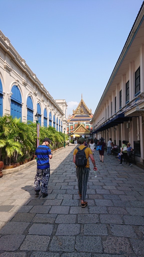 If you’re going to a temple, or any religious area in Thailand, it’s respectful to cover yourself up – trousers, covered shoulders and no bare toes in those sandals. In some places they will let the tourists off, but not at the Grand Palace. This is the ceremonial home of the King. If, like Gary, you forget to bring trousers, you can always buy some outside…
