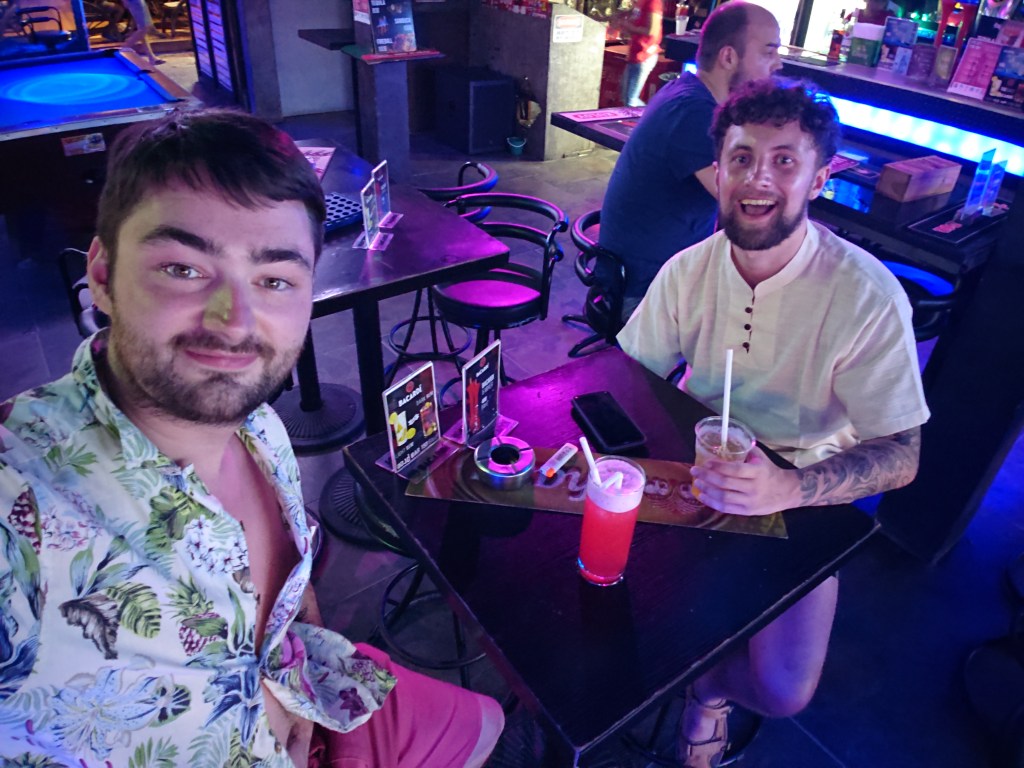 Koh Phi Phi Don is a tourist hotspot. There were lots of bars and lots of beautiful women and hunky men. Andy and I brought our dad-bods to the party and settled first at Dojo Bar.