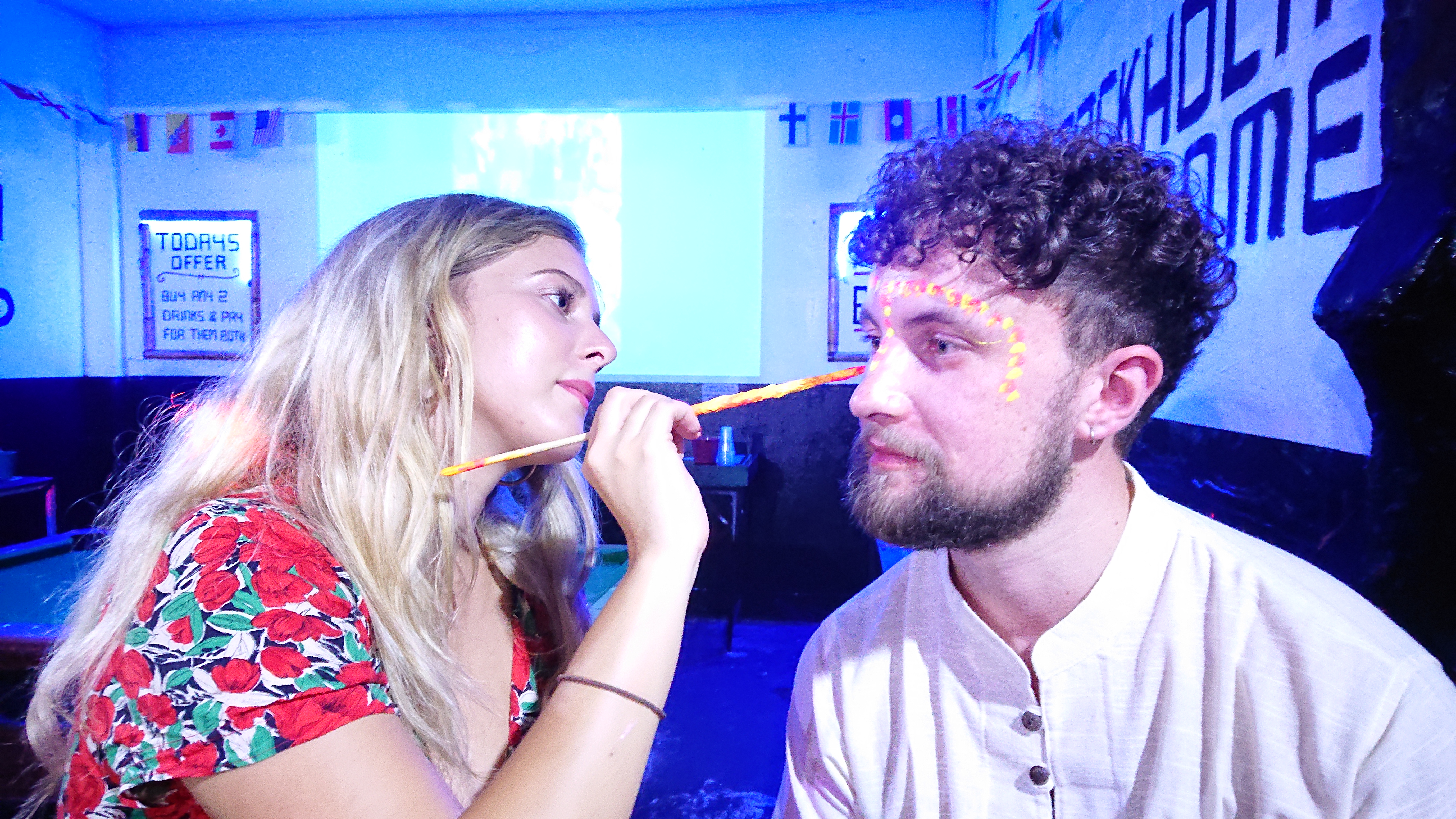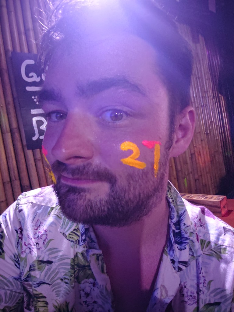 We met a southern English lass named Kalreece and she painted Andy’s face. A man came over and painted a “21” on my cheeks. That wouldn’t do – I grabbed the paint and did some editing.