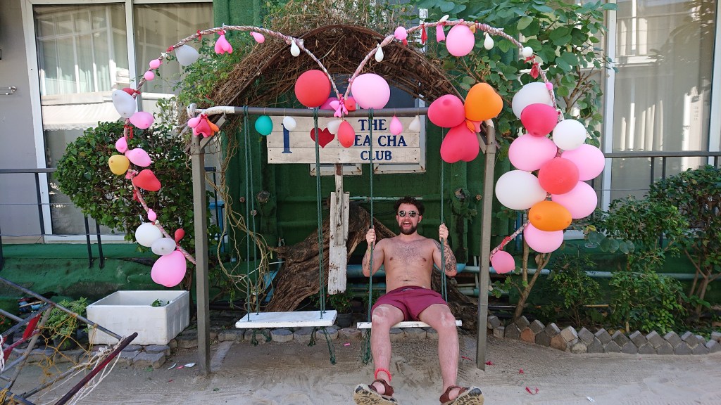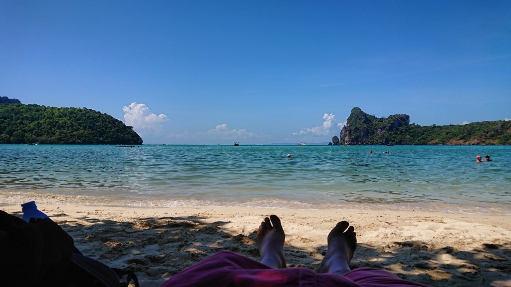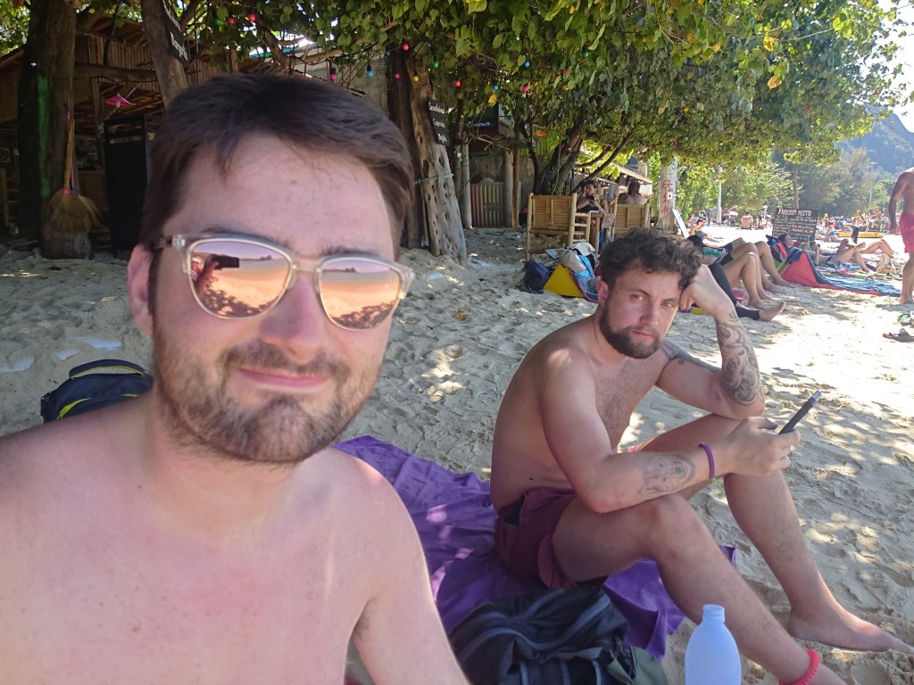 We found a bit of shade on Loh Dalum Beach. Hungover Andy was all about shade today. It was pretty damn hot so I was not complaining. On the way to the beach we had both bought a vest that featured Homer Simpson hiding in the bushes. This was a synonym for Andy’s adventures on Phi Phi.