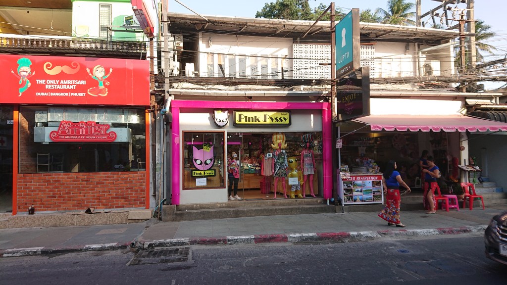 Day 3 in Patong was a hangover day, once again chilling on a beach under grey clouds. We saw another shop with an interesting name.