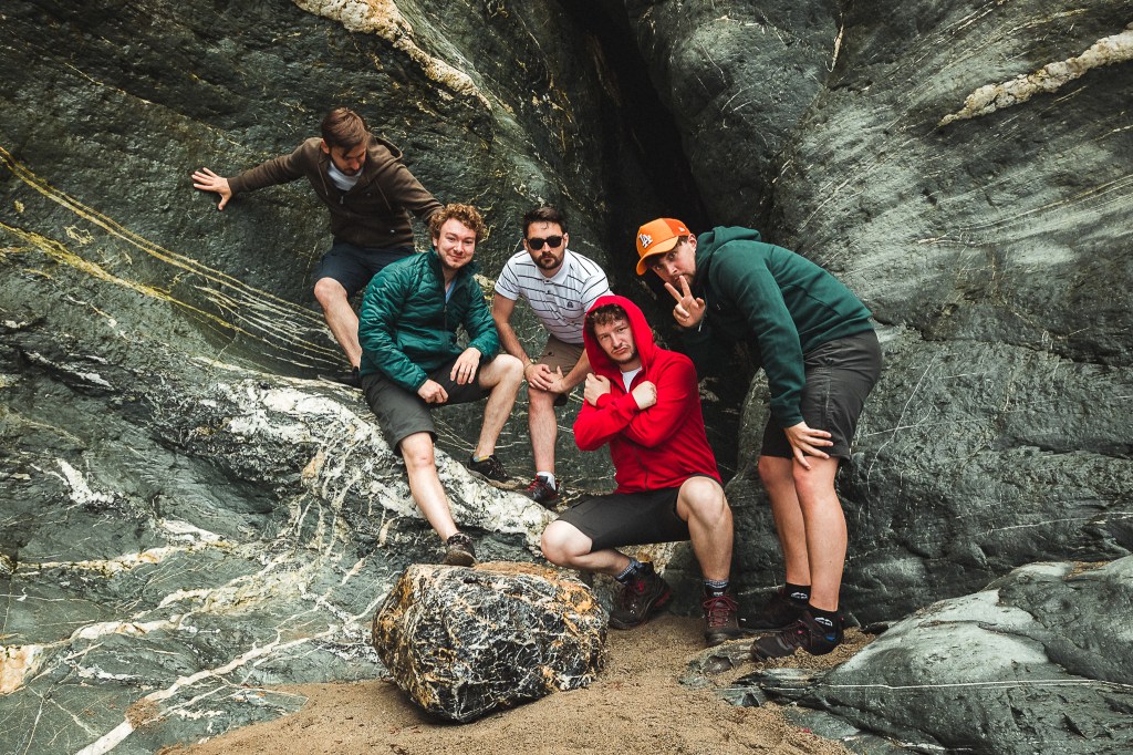 There were lots of good skimming stones and I had a good time. After Joel embarrassed me in a game of See-Who-Can-Throw-Stones-And-Hit-The-Rocky-Island, we joined the others at a crack in the cliff for some band photos.