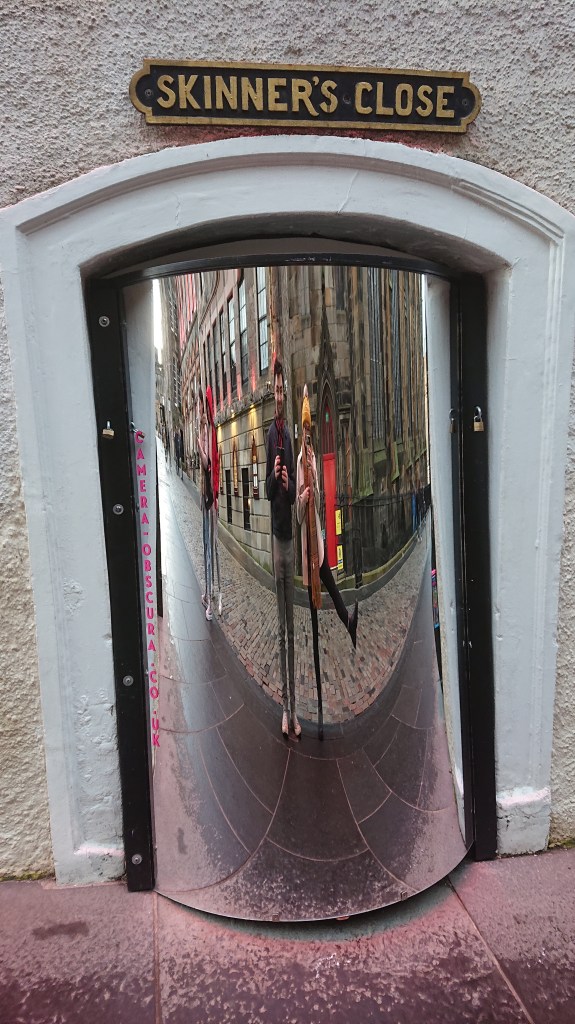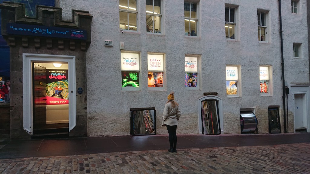 We headed down Castlehill towards the Royal Mile. Between the castle and the Tolbooth Kirk (the top of the Gothic spire is the highest point in central Edinburgh), you can find the Camera Obscura and World of Illusions.