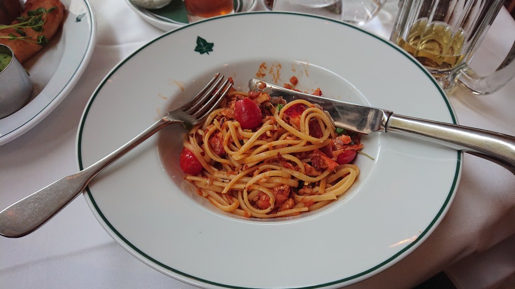 I’ve heard many good things about The Ivy but I’ve never been to one. It was my birthday trip, I suppose. I ordered lobster linguine with tomatoes and chilli for £29.95 and this was my meal.