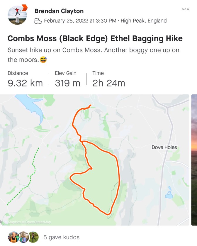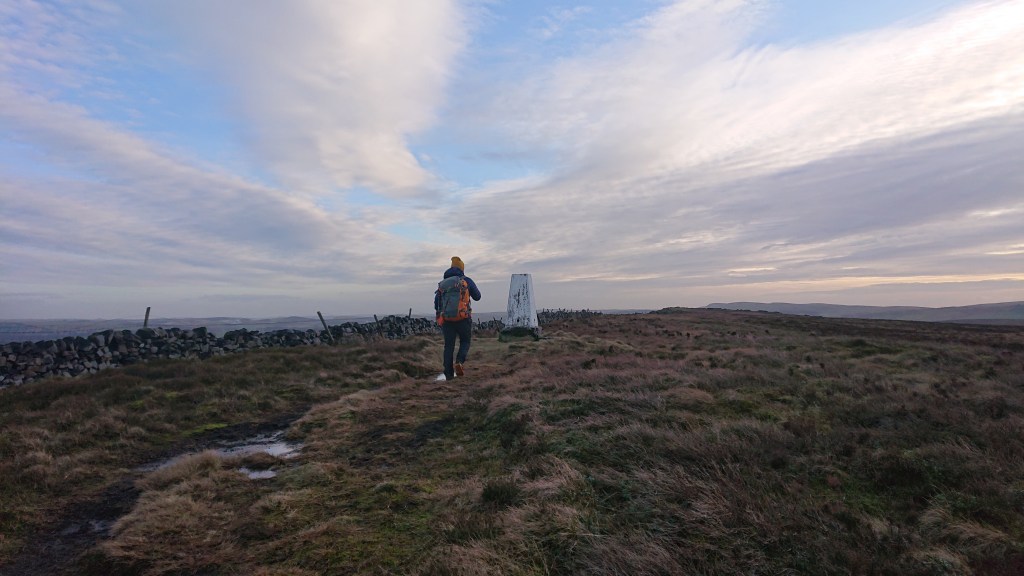 The Combs Moss plateau has a second trig point at Combs Head, but we would not get there before sunset and I didn’t fancy walking through bog in the dark without a head torch. Also, Brendan has already bagged that Ethel. That one’s for another time…