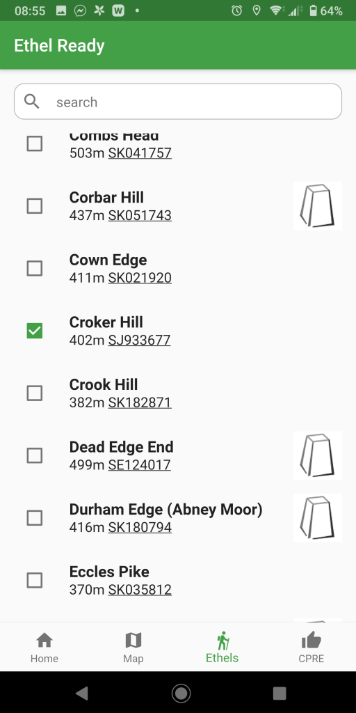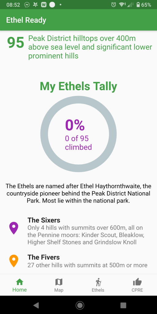 Since last June, Brendan has been undertaking a hill climbing challenge called Ethel Bagging. The Ethels are 95 prominent hills in the Peak District, mostly over 400m above sea level, and the challenge – created last year by CPRE, The Countryside Charity – is to top them all. They’ve released an app called ‘Ethel Ready’ which maps out all Ethel locations and allow you tick them off.