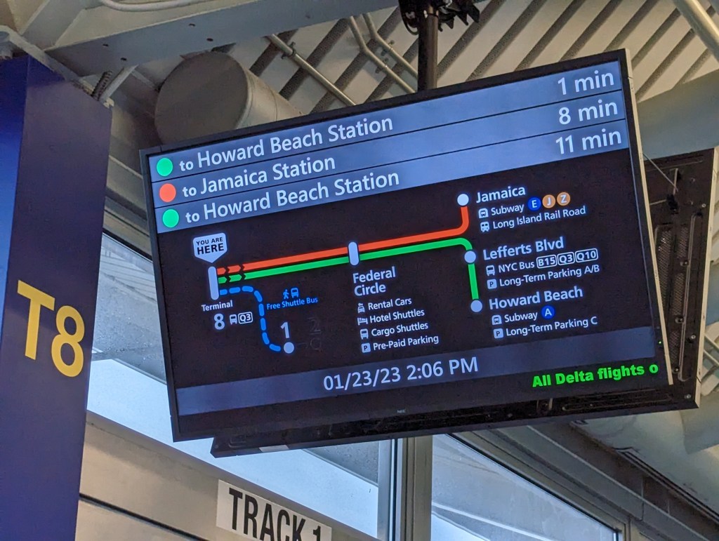 As soon as you leave the terminal there are airport staff calling out through the horn honking (you’ll get used to that in New York), directing you to the free buses that will take you to Terminal 8 and the AirTrain.