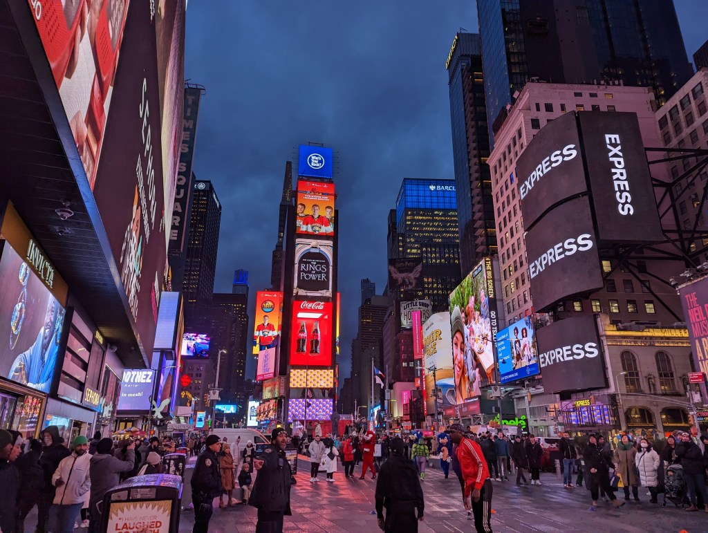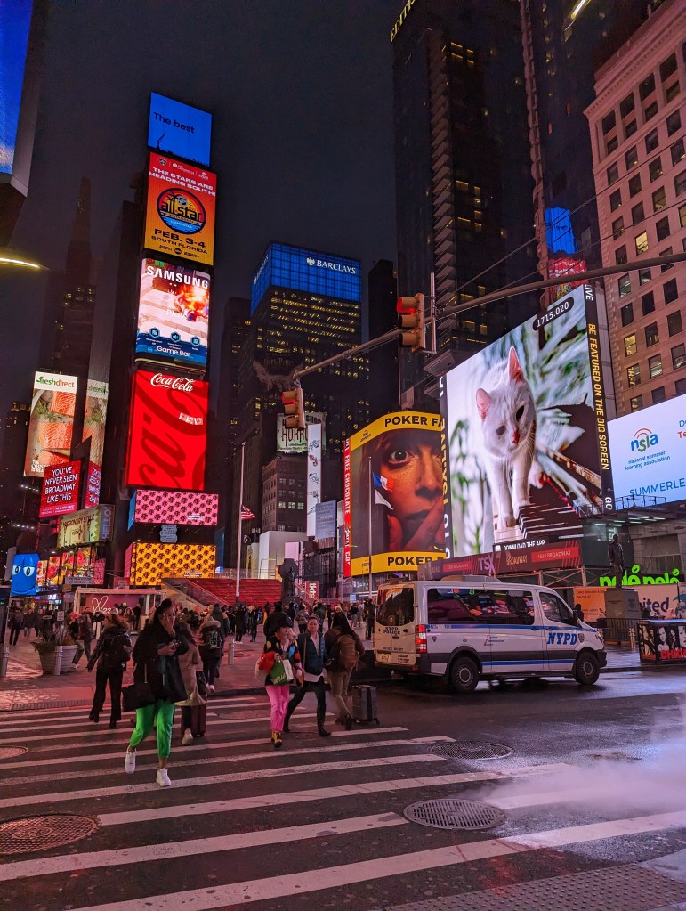 But with suitcases now in the room, we thought we may as well have another look at the bright lights of Times Square.